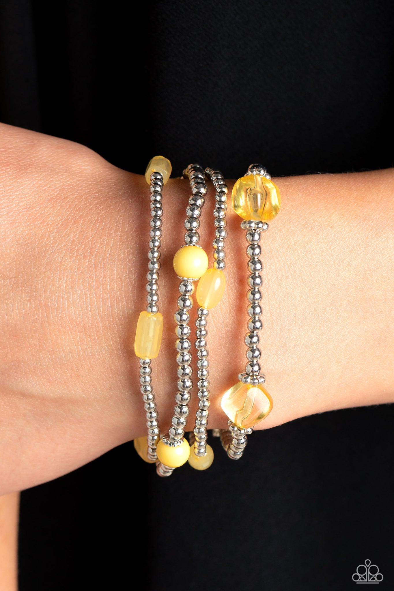 Dainty silver beads, silver accents, and primrose acrylics in milky, transparent, and solid shades wrap around the wrist on elastic stretchy bands for a colorfully geometric display.