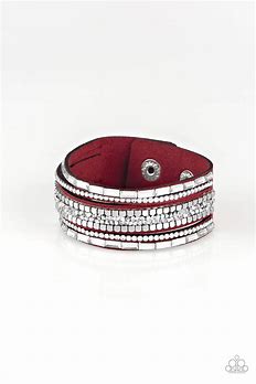 Featuring round and emerald style cuts, glassy white rhinestones join flat silver cubes and metallic prism rhinestones along a red suede band for a sassy look. Features an adjustable snap closure.