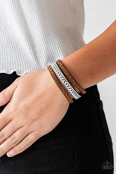 Rows of glassy topaz and white rhinestones and a shimmery silver chain are encrusted along brown suede bands for a sassy look. Features an adjustable snap closure.